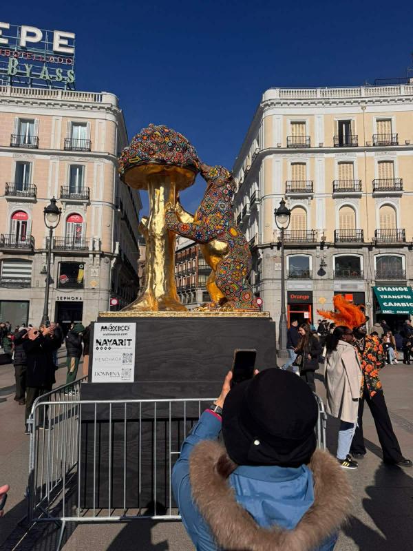 Madrid fue escenario de un encuentro cultural histórico con la develación de una pieza artística intervenida con arte wixárika, instalada frente al emblemático Oso y el Madroño, en la Puerta del Sol. La obra, elaborada por artesanas y artesanos wixárikas, simboliza el hermanamiento entre Nayarit y Madrid, integrando elementos de la cosmovisión ancestral y técnicas tradicionales como la chaquira.