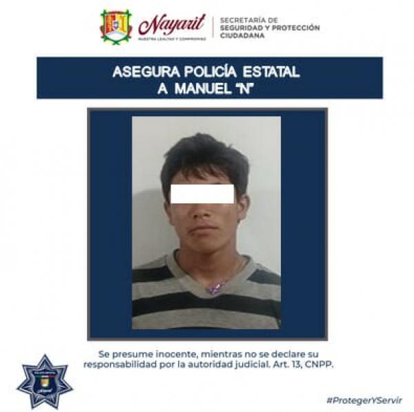 1.- Marco "N" "N", de 23 años de edad, en la colonia El Faisán, asegurándole un vegetal verde y seco con las características propias de la droga conocida como marihuana contenida en un envoltorio de plástico transparente.