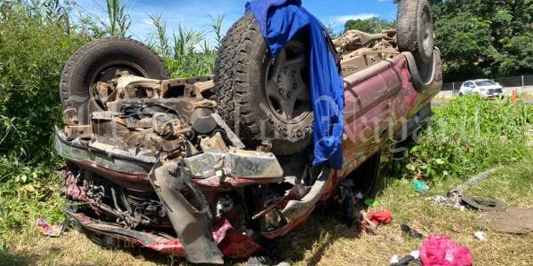 Acto seguido, la camioneta roja salió proyectada y se impactó contra el remolque de una camioneta que se encontraba en el lugar, posteriormente la camioneta Toyota quedó volcada sobre su toldo.