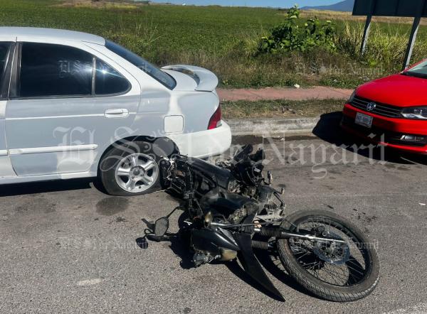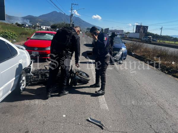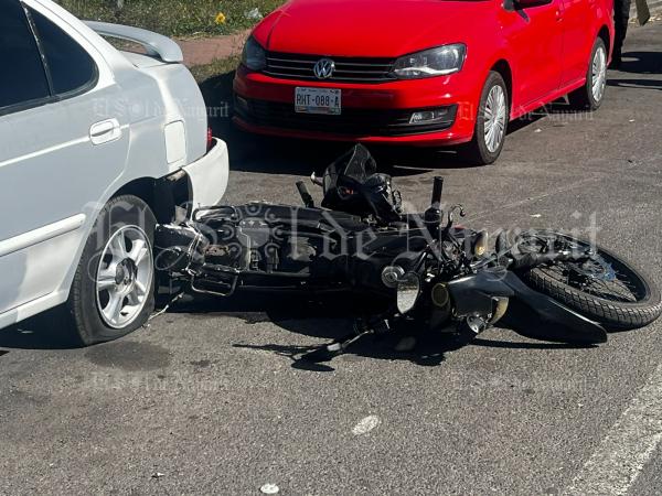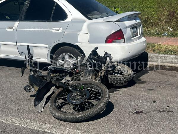 De acuerdo con la información, una motocicleta de la marca Italika tipo DM200 en color negro repentinamente salió de entre los vehículos estacionados y se incorporó al carril, el conductor de un vehículo Nissan Versa en color azul no pudo evitar el impacto.