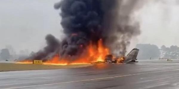 En las fotografías compartidas en redes sociales se puede apreciar el avión envuelto en llamas cerca de la pista del aeropuerto.