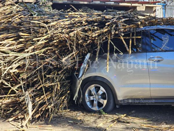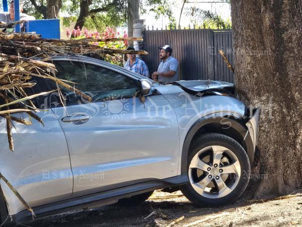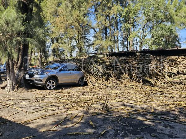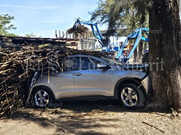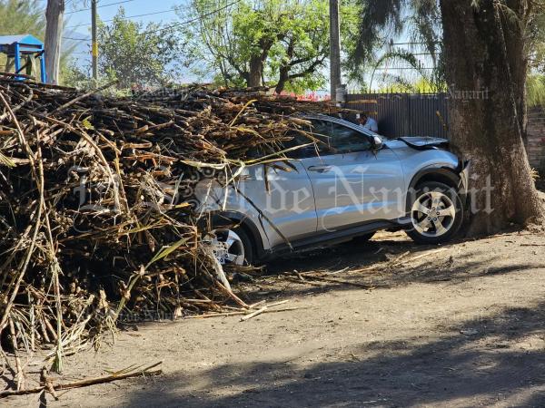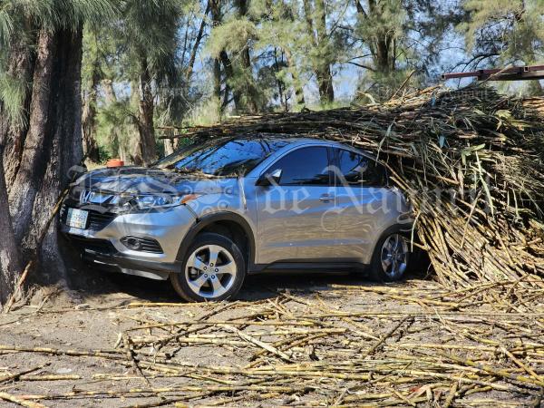 Tras la volcadura, una parte de la carga de caña cayó directamente sobre una camioneta de la marca Honda en color gris, que se encontraba estacionada en el lugar. El impacto fue de tal magnitud que la camioneta salió proyectada hasta chocar de frente contra un árbol.