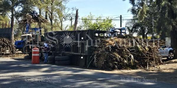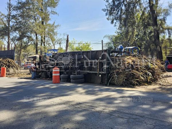 Elementos de la Policía Municipal de Xalisco arribaron al sitio para realizar los trámites correspondientes mientras se realizan las maniobras para retirar las toneladas de caña y las unidades siniestradas.