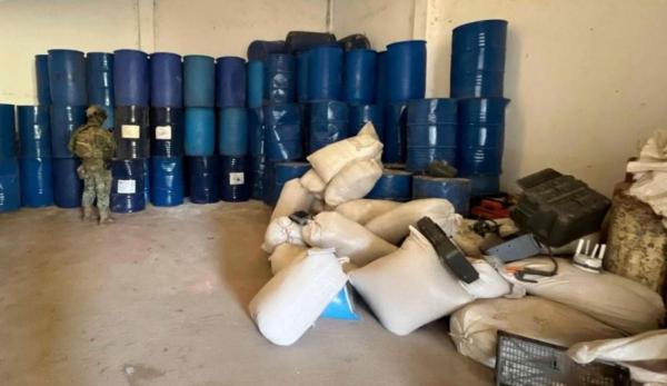 El primer inmueble cateo era utilizado como bodega, las fuerzas de seguridad localizaron una cantidad masiva de sustancias químicas esenciales para la elaboración de estupefacientes. Según el reporte oficial, se contabilizaron: