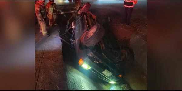 Luego de recibir el reporte a la línea de emergencias del 911, al lugar se trasladaron elementos de los Bomberos Estatales localizaron una camioneta tipo Pick Up en color negro, la cual se encontraba volcada sobre una cuneta.