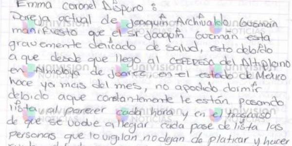 La cadena estadounidense Univisión, publicó una carta escrita a mano por Coronel, en la que ella describe la situación que presuntamente está pasando el capo.