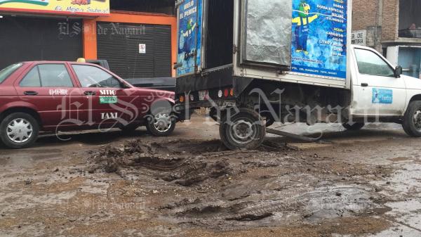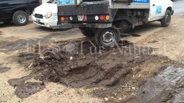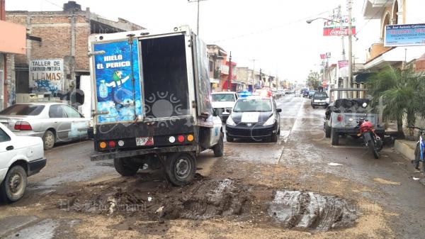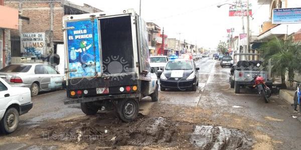 Un percance vial tuvo lugar la mañana de este martes en calles de la colonia López Mateos, de Tepic, donde un vehículo de la empresa hielera El Perico terminó atascado en una zanja llena de lodo.