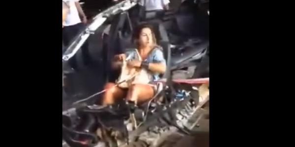 En un video que circula en redes sociales, se observa a la mujer sentada dentro de lo que queda del automóvil, mientras que el conductor está inmóvil entre los fierros del vehículo.