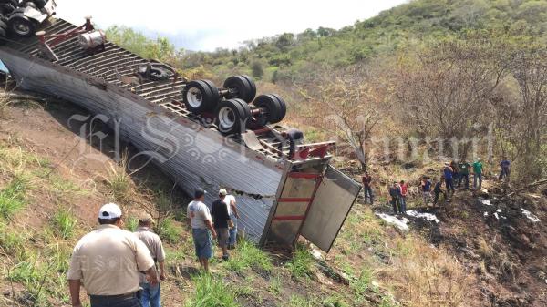 Fue a la altura del kilómetro 22+50, a unos metros del mirador del Águila, donde un pesado tráiler cargado de chile serrano, que se dirigía a Tepic desde Culiacán, Sinaloa, se volcó tras salir de una curva y terminó proyectándose hacia un barranco.