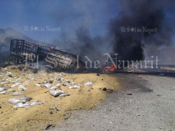 La unidad que transportaba frijol, comenzó a incendiarse y según testigos, el conductor fue expulsado de ésta, sufriendo severas quemaduras en la mayor parte del cuerpo.
