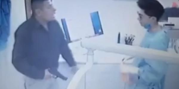 El video muestra cuando el hombre llega al consultorio, bebe agua de una botella y segundos después, cuando el dentista se da vuelta, saca de entre sus ropas una pistola.
