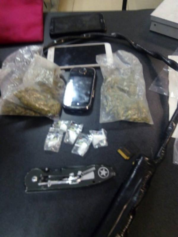 Tras una revisión física del vehículo y de las personas, los agentes federales aseguraron 3 bolsas de plástico que contenían hierba seca con las características de la mariguana, además de 5 dosis de la droga conocida como cristal y tres mil 673 pesos en efectivo, un teléfono celular y una navaja.