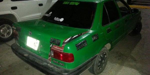 En el tramo Tepic-Crucero de San Blas, los agentes federales tuvieron contacto con un vehículo Nissan color verde, del servicio de transporte público local taxi, con placas de circulación 3335 MDD, conducido por un hombre de 23 años de edad.