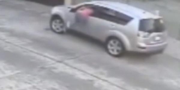 La mujer rápidamente persigue a sus agresores en un intento por recuperar sus objetos y trata de ingresar a la unidad por la ventana del lado del conductor.