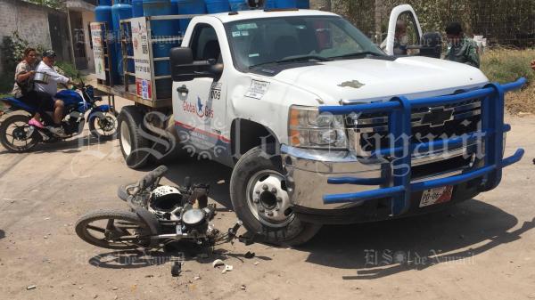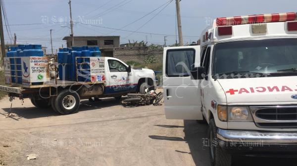 Motocicleta y camión repartidor de gas protagonizan accidente en la colonia Valles de Nayarit, al parecer ocasionado por el conductor del vehículo repartidor. Dos personas resultaron lesionadas.