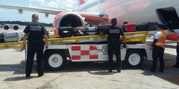 Elementos de la Policía Federal decomisaron 15 kilogramos de cocaína a bordo de un avión, en el Aeropuerto Internacional de Cancún, Quintana Roo.