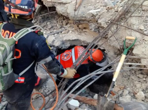 Los agentes cuentan con el apoyo de cuatro ejemplares caninos, además de un equipo especializado como rompedores de concreto, mandarrias, cuerdas y arneses para rescate en vertical, además de material médico.