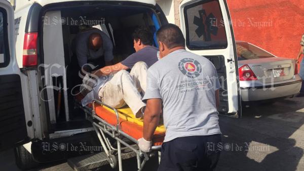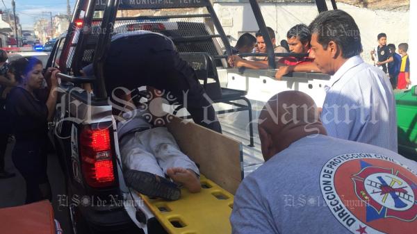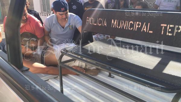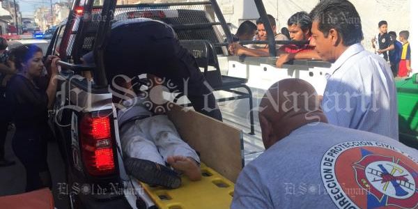 Ante la falta de ambulancia, agentes de la SSPM de Tepic, tomaron una tabla para usarla como camilla y subir al lesionado a la cajuela de la unidad, donde se pretendía llevarlo al hospital General de Tepic.