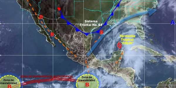 El Servicio Meteorológico Nacional (SMN) alertó que los desprendimiento nubosos de la tormenta tropical Colin en el Golfo de México provocarán lluvias muy fuertes con tormentas eléctricas y posibles granizadas en Yucatán y Quintana Roo, y lluvias fuertes en Campeche.