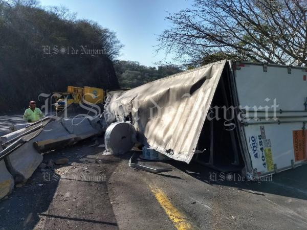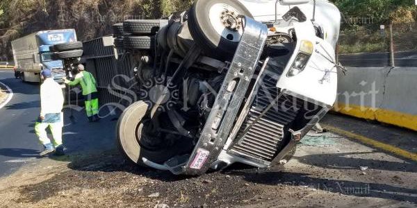 Un tráiler de la empresa "LALA", volcó durante la tarde de este miércoles cuando circulaba sobre la autopista Tepic-Mazatlán.