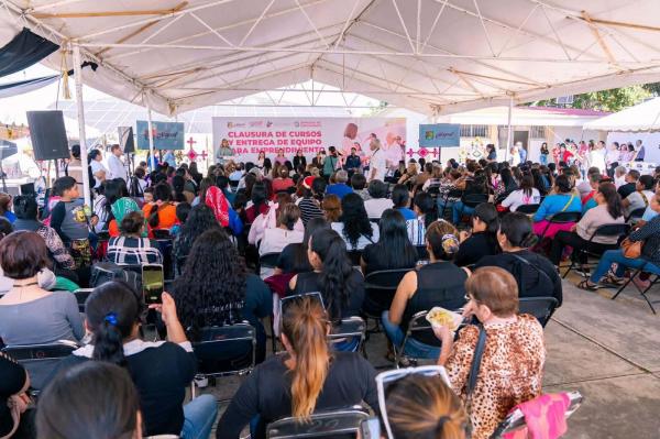 Durante el evento, más de 400 alumnas y alumnos concluyeron satisfactoriamente su proceso de capacitación y recibieron apoyos productivos consistentes en equipos para iniciar sus emprendimientos, lo que contribuirá a reactivar la economía en sus comunidades.