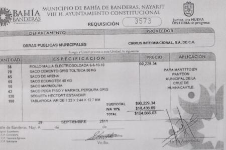 Fueron 38 rollos de malla electrosoldada con medidas de 6-6-10-10, así como 7 toneladas de sacos de cemento gris Tolteca, 65 sacos de arena, 60 sacos de Econotex de 40 kilogramos cada uno, 50 sacos de marmolina, 42 sacos de pega piso y mármol Perdura gris, 120 seguetas Hectort Estándar y 180 tabla rocas WR de 1.22 por 2.44 por 12.7 mm. Material de construcción que la Dirección de Obras y Servicios Públicos Municipal solicitó al proveedor, Cirrus Internacional S.A de C.V con fecha 29 de septiembre 2011 por la cantidad de 104 mil 666 pesos, según la requisición número 3573 que Obras Públicas elaboró, pero este material, como se menciona líneas arriba, no fue aplicado a dicho panteón, según informó en su momento el delegado de la Cruz de Huanacaxtle, Ángel Alberto García del Haro.