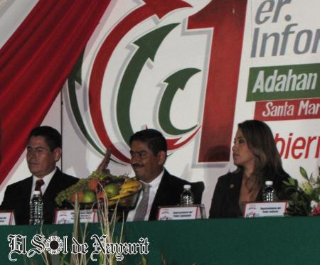 Con la presencia de Regidores y el Síndico del XXXIX Ayuntamiento de Santa María del Oro; del secretario de Desarrollo Rural, Fidel Cristóbal Serrato, en representación del gobernador Roberto Sandoval Castañeda; de la diputada Jocelyn Fernández Molina, representante del H. Congreso del Estado, y de Alba Xóchitl Guzmán Olague, Juez Mixto, con la representación del tribunal Superior de Justicia, el presidente municipal Adahán Casas Rivas, cumpliendo el mandato que ordena el artículo 65 fracción IX de la Ley Municipal para el Estado de Nayarit, rindió su primer informe de Gobierno.