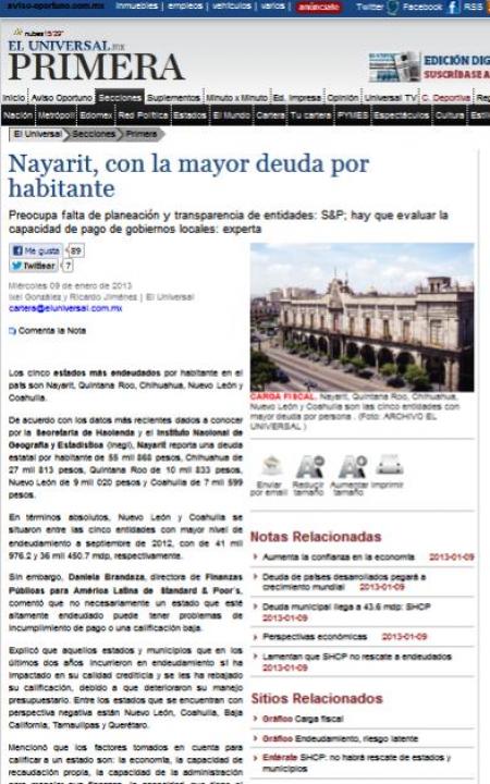 La publicación señalaba que en base a recientes datos dados a conocer por la Secretaría de Hacienda y el INEGI, Nayarit reportaba una deuda estatal por habitante de 55 mil 868 pesos.