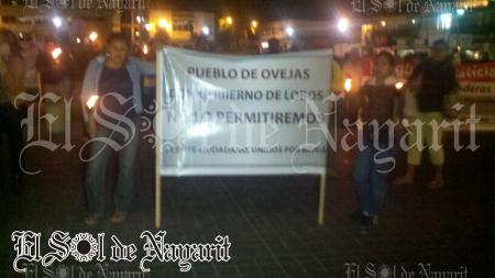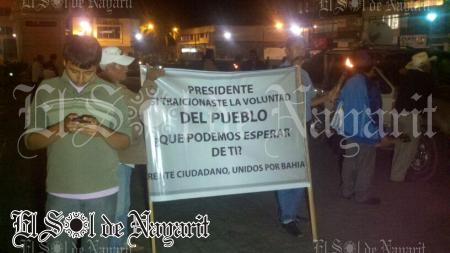 Cerca de 200 personas, vecinos de Bahía de Banderas, llevaban algunas mantas, aludiendo la pésima función que ha desempeñado Rafa Cervantes al frente de la administración de ese municipio.