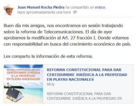 La mañana de este miércoles, el diputado federal por Nayarit, Juan Manuel Rocha Piedra, fue duramente criticado en las redes sociales por la aprobación al Artículo 27, Fracc. I, de la Constitución, pues demostrando una vez más su escaso conocimiento, presumió que el día de ayer habían aprobado la reforma donde permite a los extranjeros adquirir en propiedad tierras en zonas litorales y fronterizas de México.