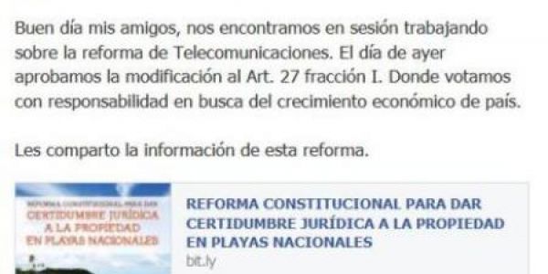 DETRAS DE ESTA LEY ESTA EL NEFASTO EPN QUE ES MANIPULADO POR CARLOS SALINAS, QUE VERGUENZA LA ACTITUD DE ESTOS PRIISTAS, DIPUTADOS Y SENADORES QUE DICEN SENTIRSE ORGULLOSOS DE VENDER NUESTRA PATRIA A ESTRANJEROS, LOS MEXICANOS NO TENEMOS NINGUNA PROPIEDAD EN ESTOS LUGARES POR LO CARISIMO DE ESTOS TERRENOS AHORA TODO VA A SER PROPIEDAD DE EXTRANJEROS QUE TORPES Y PATETICO EL DECIR QUE ESTAN ORGULLOSOS DE ESTA NUEVA LEY NUESTROS HEROES NACIONALES E HAN DE ESTAR REVOLCANDO DE DISGUSTO.