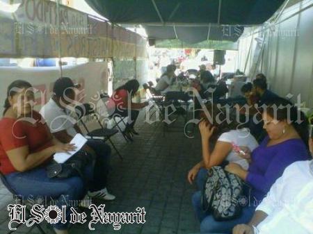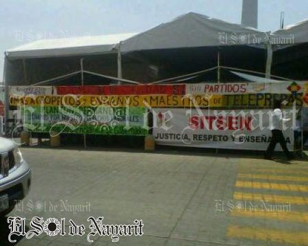 Un grupo de profesores de Telepreparatorias continúan plantados en la plaza Bicentenario de Tepic, Nayarit, a la espera que se firme su contrato laboral.