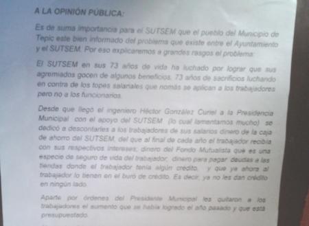 Explican que desde que llegó Héctor González Curiel a la Presidencia Municipal, precisamente con el apoyo del SUTSEM, se dedicó a descontarles de sus salarios dinero de la caja de ahorro del SUTSEM del que a final de cada año recibía con sus respectivos intereses; así mismo les descuenta dinero del fondo mutualista que es una especie de seguro de vida del trabajador, también les descuenta dinero para pagar deudas a las tiendas donde el trabajador tenía algún crédito, situación que ahora mantiene al trabajador en el buro de crédito ya que El Toro no ha pagado a las tiendas.
