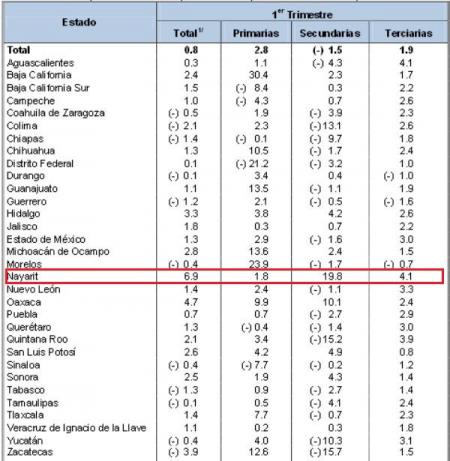 De acuerdo con el Instituto Nacional de Estadística y Geografía (INEGI) a través del Indicador Trimestral de la Actividad Económica Estatal (ITAEE), dio a conocer que durante el trimestre enero-marzo de 2013, Nayarit fue el Estado que registró mayor crecimiento en su actividad económica con un 6.9 por ciento.