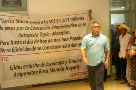 Los campesinos de los ejidos afectados por la construcción de la autopista Tepic-Mazatlán consiguieron el pasado viernes tres acuerdos con la Dirección General de la Delegación Estatal de la Secretaría de Comunicaciones y Transportes (SCT), tras varios años de ser ignorados en sus reclamos, pero sin resolverse el principal que es el pago a valor comercial actualizado de los predios.