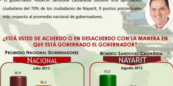 Roberto Sandoval obtuvo una aprobación ciudadana muy por arriba del promedio del resto de los gobernadores del país, pues de acuerdo con la medición de esa reconocida empresa, a la pregunta de si está usted de acuerdo o en desacuerdo en cómo está gobernando su Gobernador, Roberto Sandoval obtuvo una aprobación del 70% de los ciudadanos de Nayarit, 9 puntos porcentuales más respecto al promedio nacional de gobernadores.