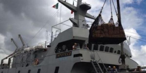 La Secretaría de Desarrollo Social (Sedesol) informó que a bordo de la embarcación se transportaron también seis toneladas de oxígeno médico y siete mil latas de atún, que serán distribuidas por personal del Fondo de Desastres Naturales (Fonden) y brigadistas de la dependencia.