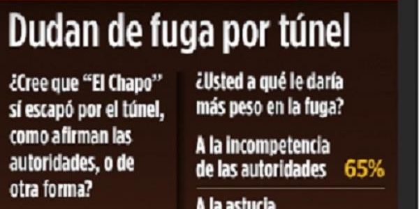 Una encuesta realizada por el diario Reforma y publicada este jueves reveló que el más de la mitad de los mexicanos no cree en la versión de las autoridades sobre la fuga de El Chapo, que aseguran huyó del Penal de máxima seguridad del Altiplano a través de un túnel.