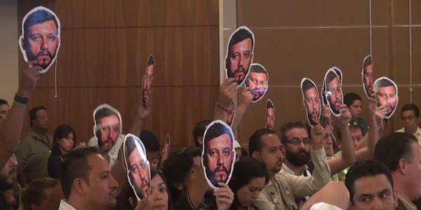 El funcionario federal acudió a ese estado para clausurar el Seminario Nacional de Autoridades Municipales Electas y durante el inicio de su discurso, los periodistas se levantaron de sus sillas y se colocaron una máscara con el rostro de Rubén Espinosa, fotoperiodista de Proceso y Cuartoscuro, asesinado el pasado 21 de julio.