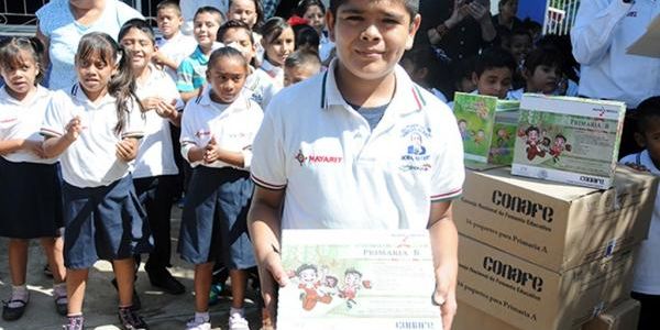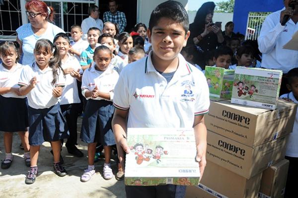 Durante el arranque de esta entrega de útiles escolares en la escuela primaria Amado Nervo, en Mora, municipio de Tepic, el Delegado de CONAFE, Fernando Méndez Medina, informó que esta entrega es parte del compromiso del presidente Enrique Peña Nieto de llevar útiles escolares a todas las regiones rurales e indígenas del país.
