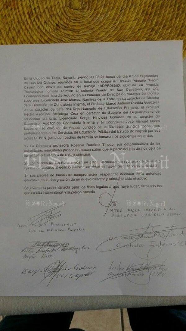 Ante esta medida de presión, autoridades de la SEP arribaron al plantel y luego de escuchar sus quejas, redactaron juntos un acta de acuerdo donde asientan su petición de destitución de Ramírez Tinoco y el compromiso de las autoridades de responder y cambiar a la docente, enviando en su lugar a una persona competente, con ética y vocación profesional.