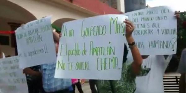 Con pancartas con frases como Ni un golpeado más... el pueblo no te quiere Chema, los inconformes se plantaron frente al Palacio Municipal para exigir al presidente de Amatlán de Cañas, Francisco López Sánchez, que destituyera de su cargo al director de Seguridad Pública.