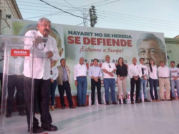 En su mensaje, Andrés Manuel López Obrador dijo que con el apoyo de loa nayaritas, Miguel Navarro Quintero será el próximo gobernador y en 2018 MORENA obtendrá el triunfo en México, para con ello sacar adelante al pueblo nayarita, del abandono que se encuentra por culpa de malos gobiernos.