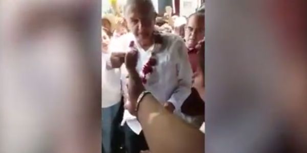 Inmediatamente López Obrador baja el rostro al piso e intenta limpiarse con un objeto, ante la presencia de decenas de simpatizantes de su partido, quienes al ver la acción comenzaron a gritar, rápidamente los militantes de Morena cubrieron al líder partidista para evitar que ocurriera un incidente mayor.