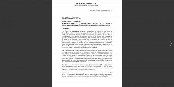 "Escuche al priismo, es la única manera de presentar un partido competitivo que pueda ganar las elecciones del 2018", concluye la misiva enviada por Democracia Interna.
