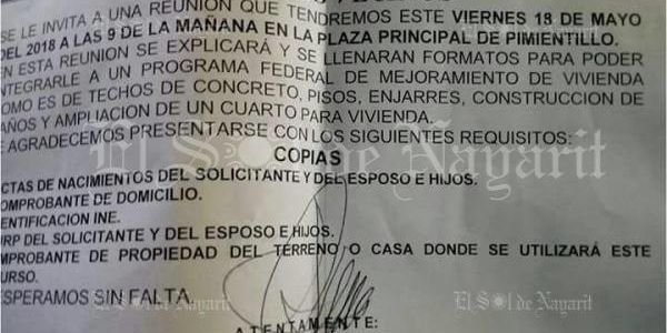 "Se les invita a una reunión que tendremos este viernes 18 de mayo del 2018 a las 9:00 de la mañana en la plaza principal de Pimientillo para integrarle a un programa federal de mejoramiento de vivienda como es de techos de concreto, pisos, enjarres, construcción de baños y ampliación de un cuarto para vivienda", señala la invitación.