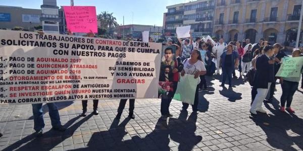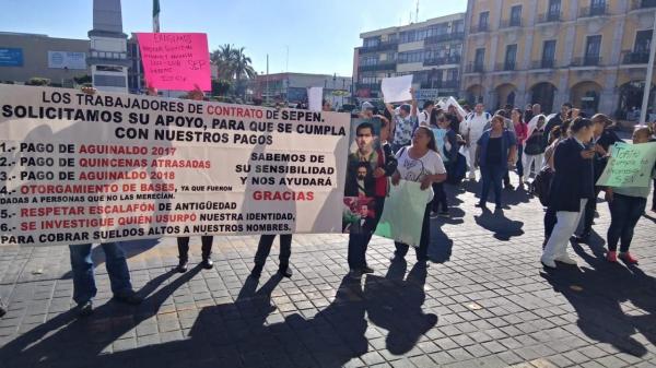 Los manifestantes del sector educativo exigen el pago del aguinaldo del año 2017 y 2018, el pago de quincenas atrasadas, el otorgamiento responsable de bases y la investigación de quién usurpó su identidad para cobrar sus sueldos.