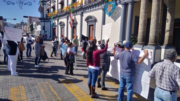 Un grupo de manifestantes acudió este miércoles a la plaza Bicentenario, frente al Palacio de Gobierno de la ciudad de Tepic, para externar su malestar por una serie de pagos que se les adeudan.