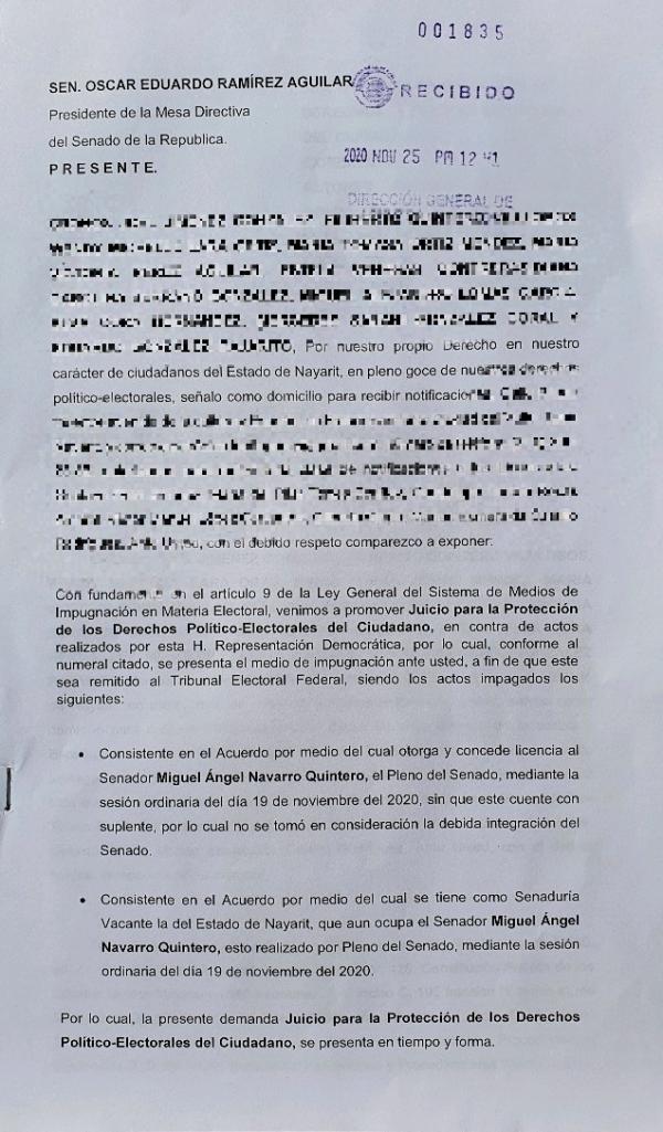 - Consistente en el Acuerdo por medio del cual se tiene como senaduría Vacante la del estado de Nayarit, que aún ocupa el Senador Miguel Ángel Navarro Quintero, esto realizado por el Pleno del Senado, mediante la sesión ordinaria del día 19 de noviembre del 2020.