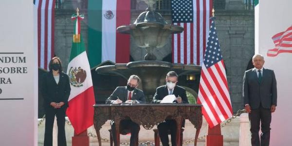 La vicepresidenta y López Obrador atestiguaron la firma de un memorándum de entendimiento en materia migratoria.